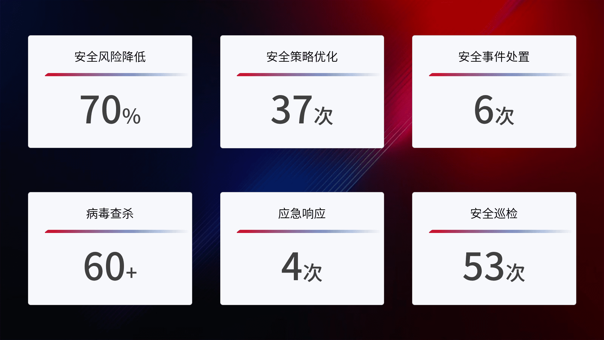 提供全面的安全事件报告体系,,,,包括处置报告、、周报、、季度和年度总结,,结合持续监控,,,,帮助客户深入了解网络安全状况。。。。