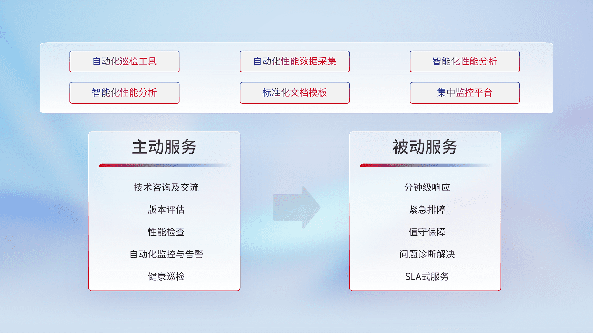 智能化工具和标准化文档,,,保障服务质量,,提供主动服务(包含技术咨询、、、、版本评估、、、性能检查、、、自动化监控与告警、、、健康巡检)和被动服务包含(分钟级响应、、、紧急排障、、、、值守保障、、问题诊断解决、、、SLA服务)。。。